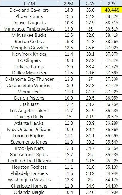 如今联盟三分出手最多的是凯尔特人,这支球队在限制区域的出手次数只排在联盟第28;相比之下,骑士的三分出手数和限制区域出手数分别排在第4和第13。