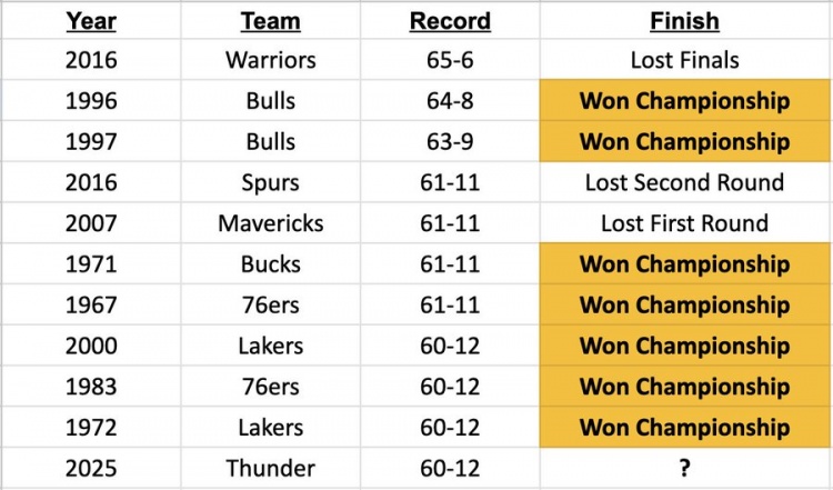 2025-03-26 13:46:57雷霆赛季前72场拿到60胜 历史第11支 前面10支最终7队夺冠
