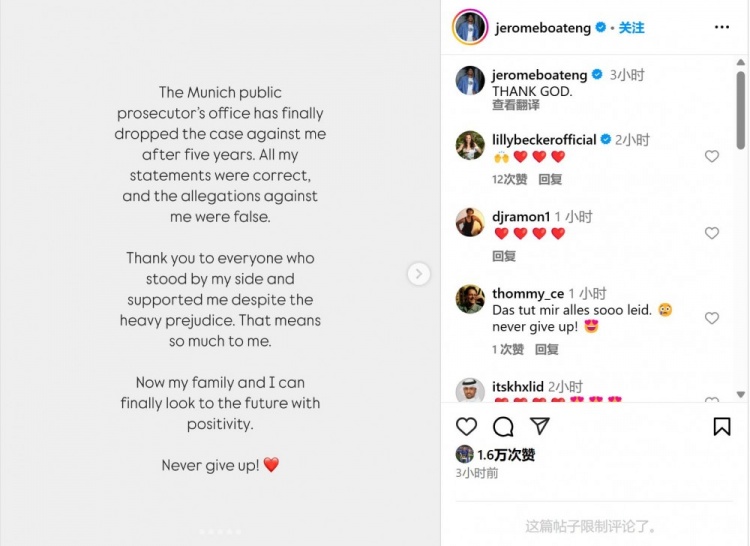 2025-03-27 08:45:02博阿滕更新社媒,庆贺针对他的家暴指控被撤销