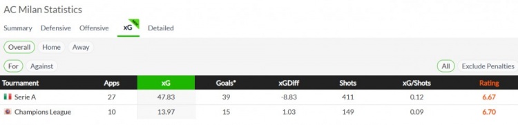 (赛季预计破门数的表现,及个人成绩。对比之下国米的预计进球数比米兰多十个)