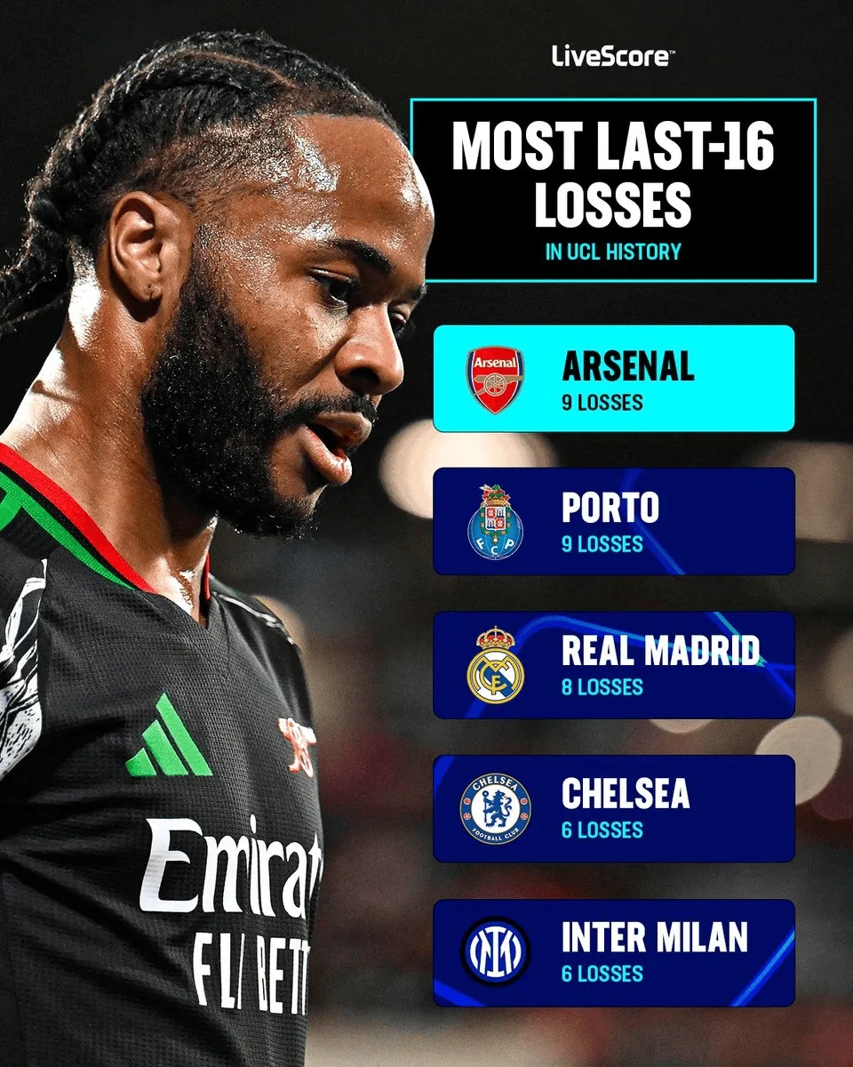 2025-03-05 03:34:32将战埃因霍温!阿森纳在欧冠16强赛中失利9次,和波尔图并列最多