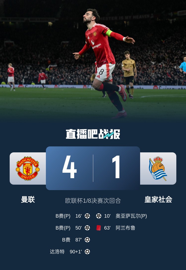 曼联欧联杯16强次回合4-1击败皇社,总比分曼联5-2晋级!B费完成帽子戏法。