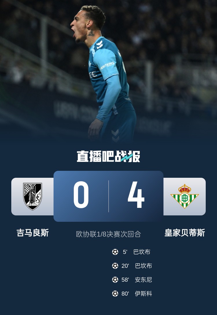 贝蒂斯4-0总比分6-2击败吉马良斯,安东尼传射+策动两球!贝蒂斯晋级欧协联8强!