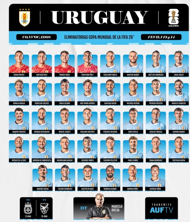 2025-03-19 07:30:04乌拉圭大名单:努涅斯、巴尔韦德、乌加特、本坦库尔入选